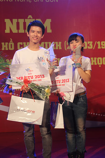 Sinh viên Nguyễn Hữu Hòa và Nguyễn Thị Hồng Thu cùng của Khoa Quản trị kinh doanh đạt giải quán quân cuộc thi Phong cách Sinh viên Công nghệ - Miss & Mr STU 2013
