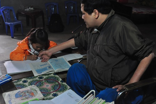 Đứng lớp trên xe lăn và dùng miệng ngậm bút viết chữ dạy học trò - người thầy đặc biệt ấy là anh Phùng Văn Trường (34 tuổi) ở thôn Nhân Lý, xã Nam Phương Tiến, huyện Chương Mỹ (Hà Nội).(17/06/2015) Chi tiết